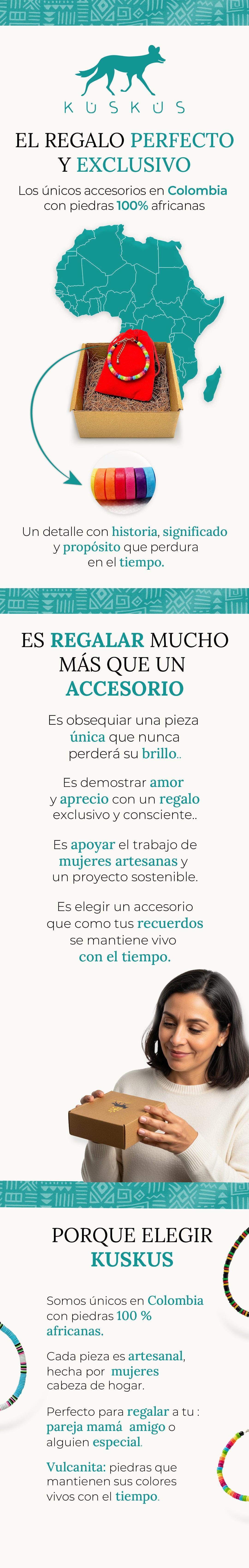 Cada pieza y cada empaque están diseñados para trascender en el tiempo, cuidando el planeta y transformando la moda en propósito. Con tu compra, apoyas a comunidades en África y Colombia, porque en Kuskus creemos en ti, en ellos y en el futuro de la tierra.